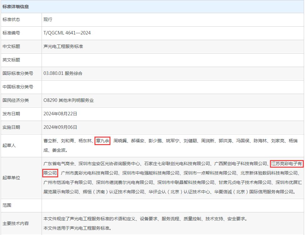 由LED工程商聯(lián)盟首次主導(dǎo)、全國城市工業(yè)品貿(mào)易中心聯(lián)合會發(fā)布的T/QGCML 4641—2024《聲光電工程服務(wù)標(biāo)準(zhǔn)》團(tuán)體標(biāo)準(zhǔn)正式發(fā)布。江蘇亮彩憑借深厚的行業(yè)經(jīng)驗(yàn)沉淀,參與到團(tuán)體標(biāo)準(zhǔn)的建設(shè)中,成為參編單位之一。
